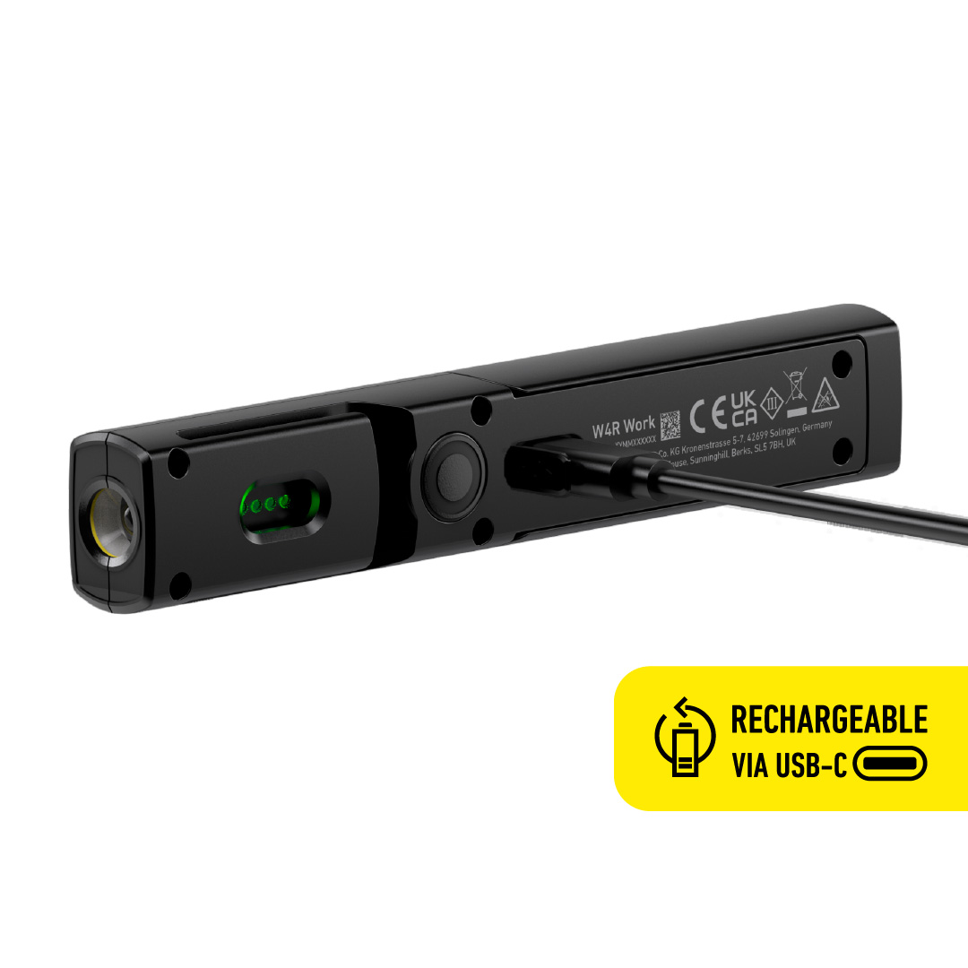 Robust, versatile, compact: The Ledlenser W4R Work is a reliable worklight for everyday workshop use. The superior Ledlenser light beam ensures precise and powerful illumination of work areas – either broadly via flood light or selectively via a spot LED in the lamp head. Thanks to the integrated magnet and swivelling base, the W4R Work can be flexibly positioned and aligned at any time. The powerful battery can be charged quickly and easily via USB-C and can be replaced if necessary. Other features include a clip for attaching to work clothing or equipment, a nubbed surface for a strong grip and a handy transport lock.